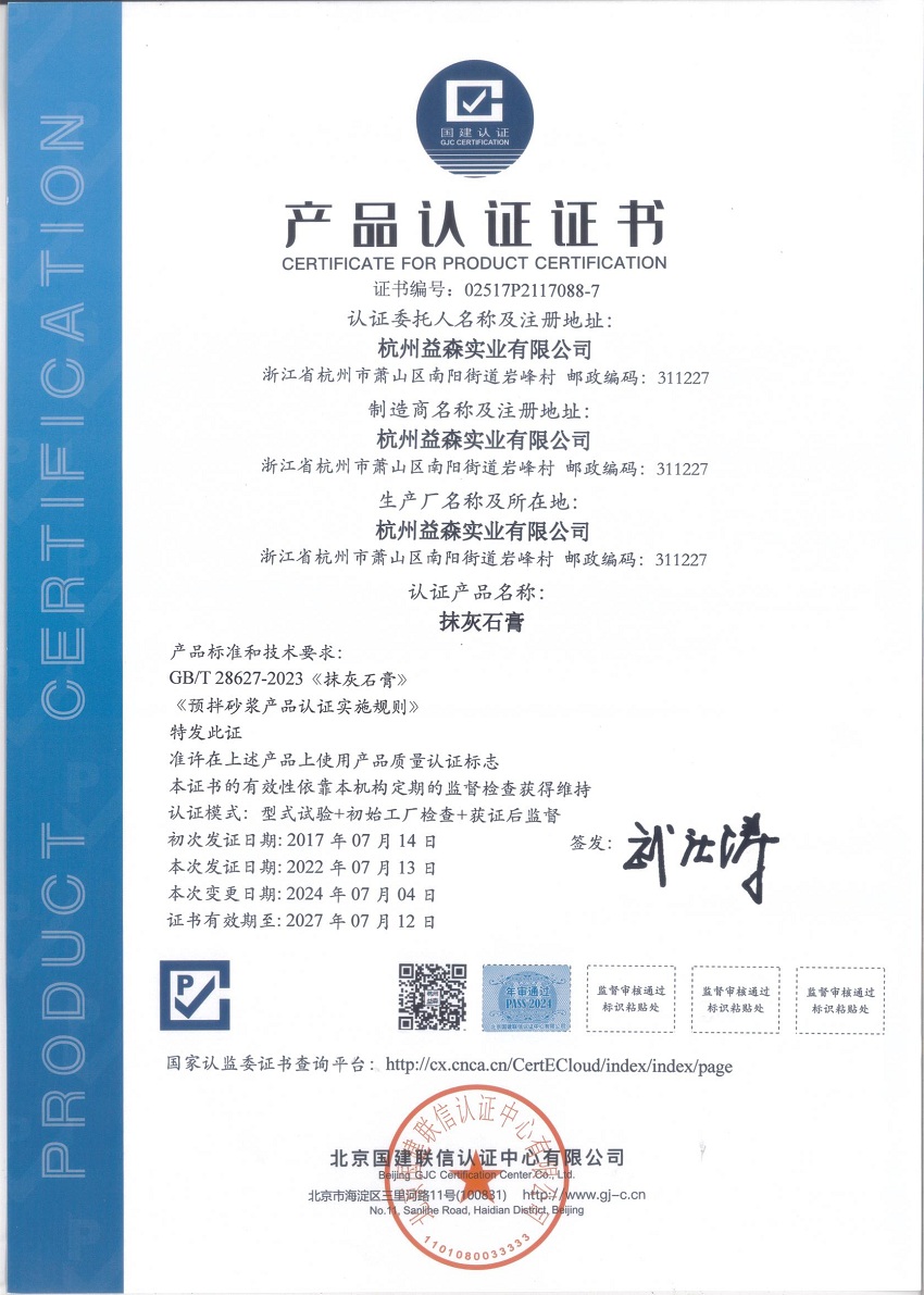 產(chǎn)品認證證書(干混陶瓷磚粘結砂漿)