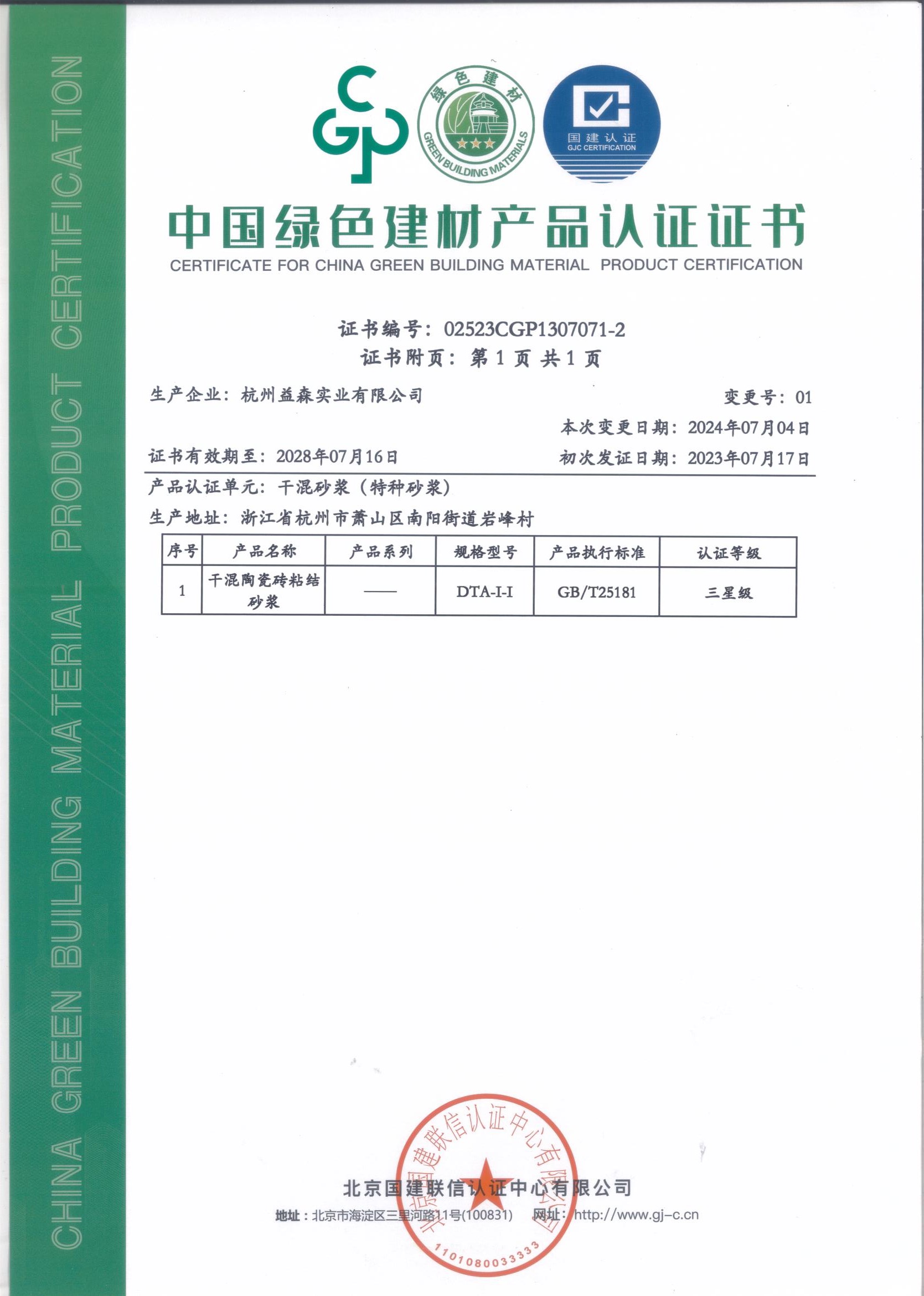 綠色建材認(rèn)證證書(shū)(特種砂漿002)