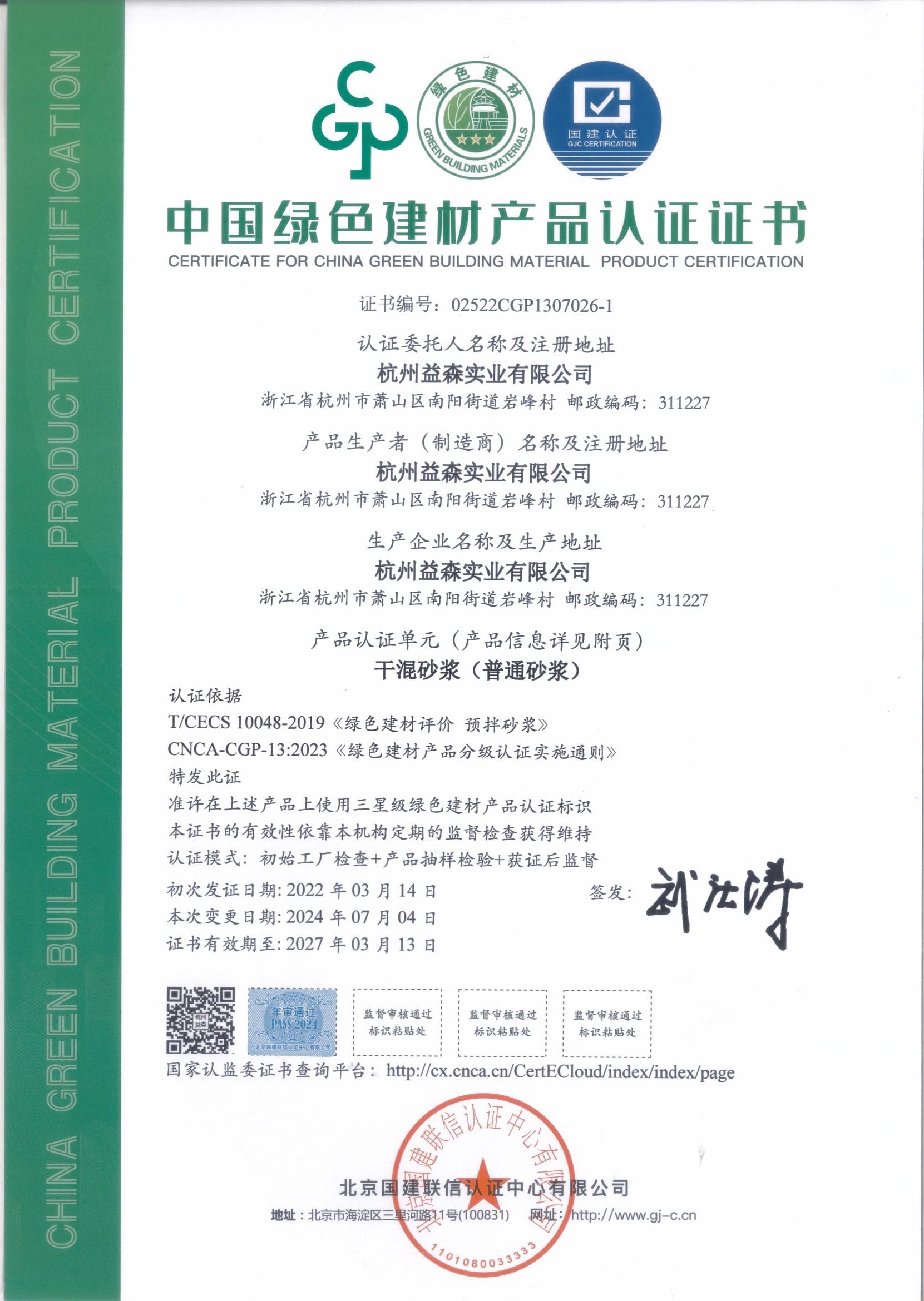 綠色建材認證證書(普通砂漿001)