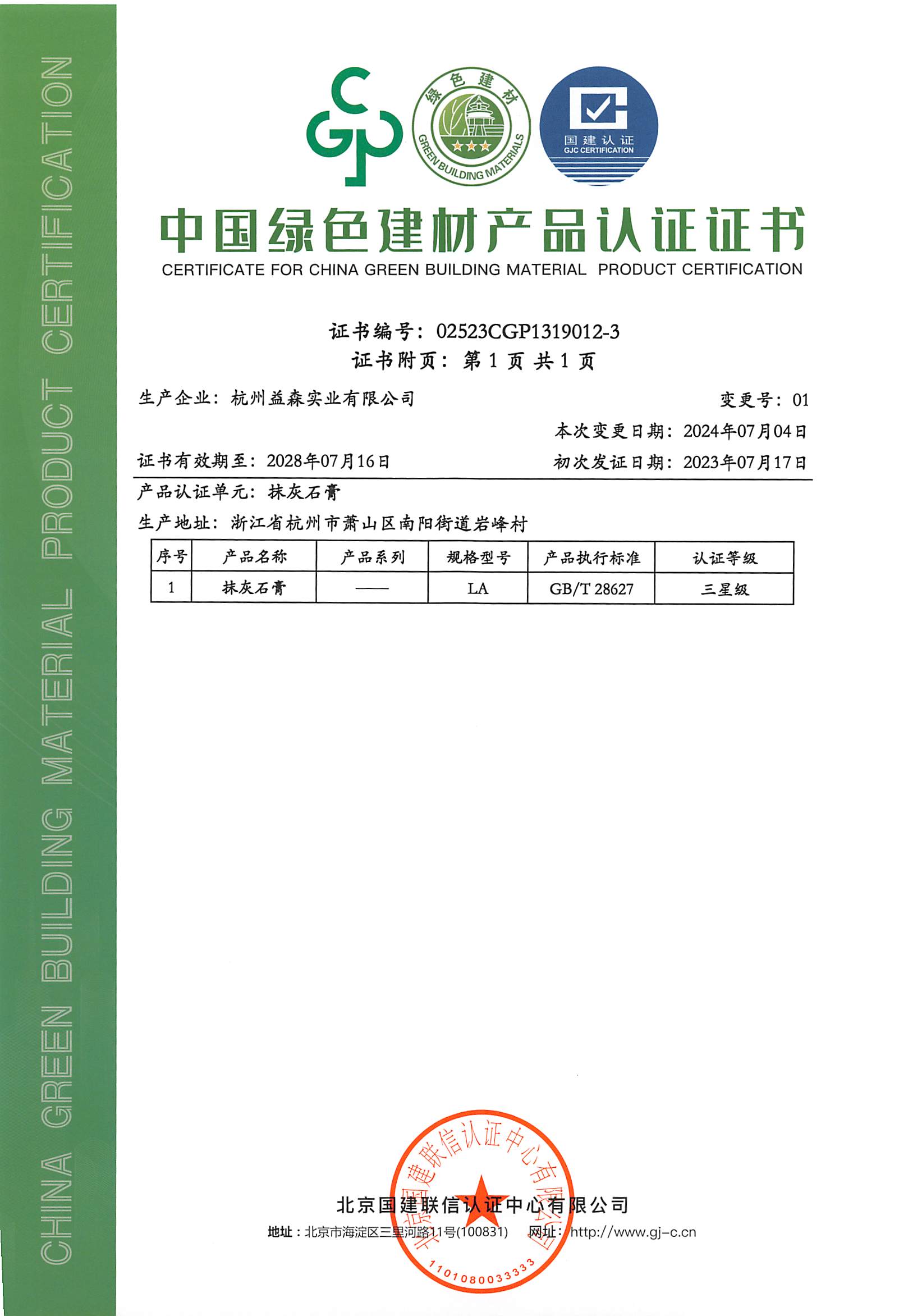 綠色建材認(rèn)證證書(shū)(抹灰石膏001)
